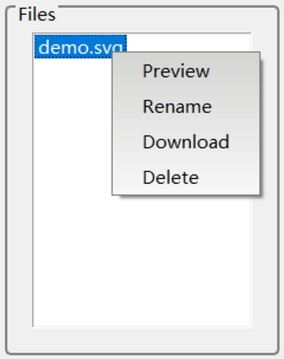 The uploaded .SVG file will be displayed in the Files section. Right-click the uploaded .SVG file, and select Preview.