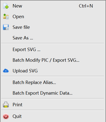 Save a file: Click File > Save File / Save As to save the current graph file in .PIC format (which is the file format used by EnOS HMI for saving the graph information).
