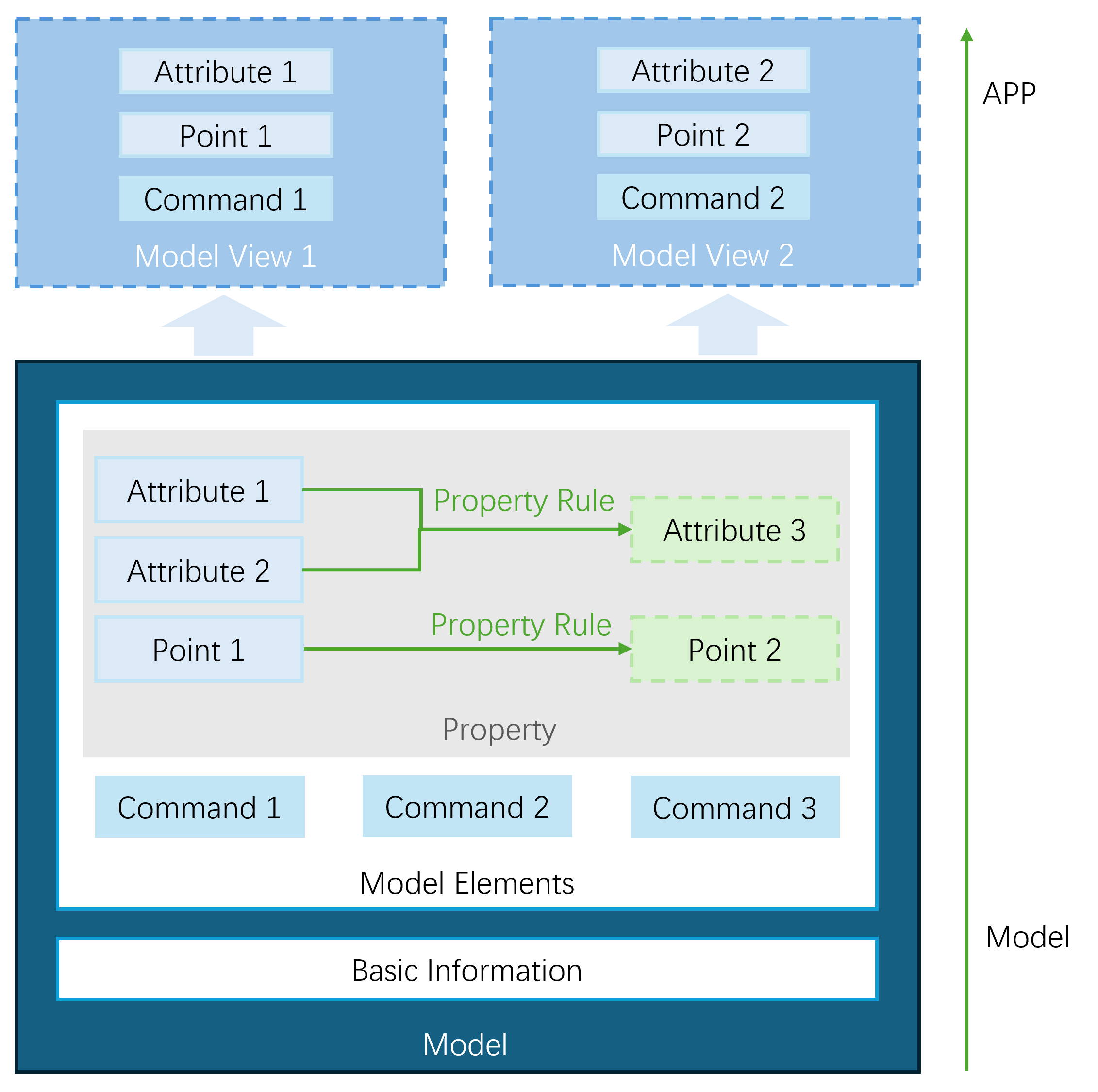 A model consists of basic information, model elements, property rules, and model views, as shown in the following diagram.