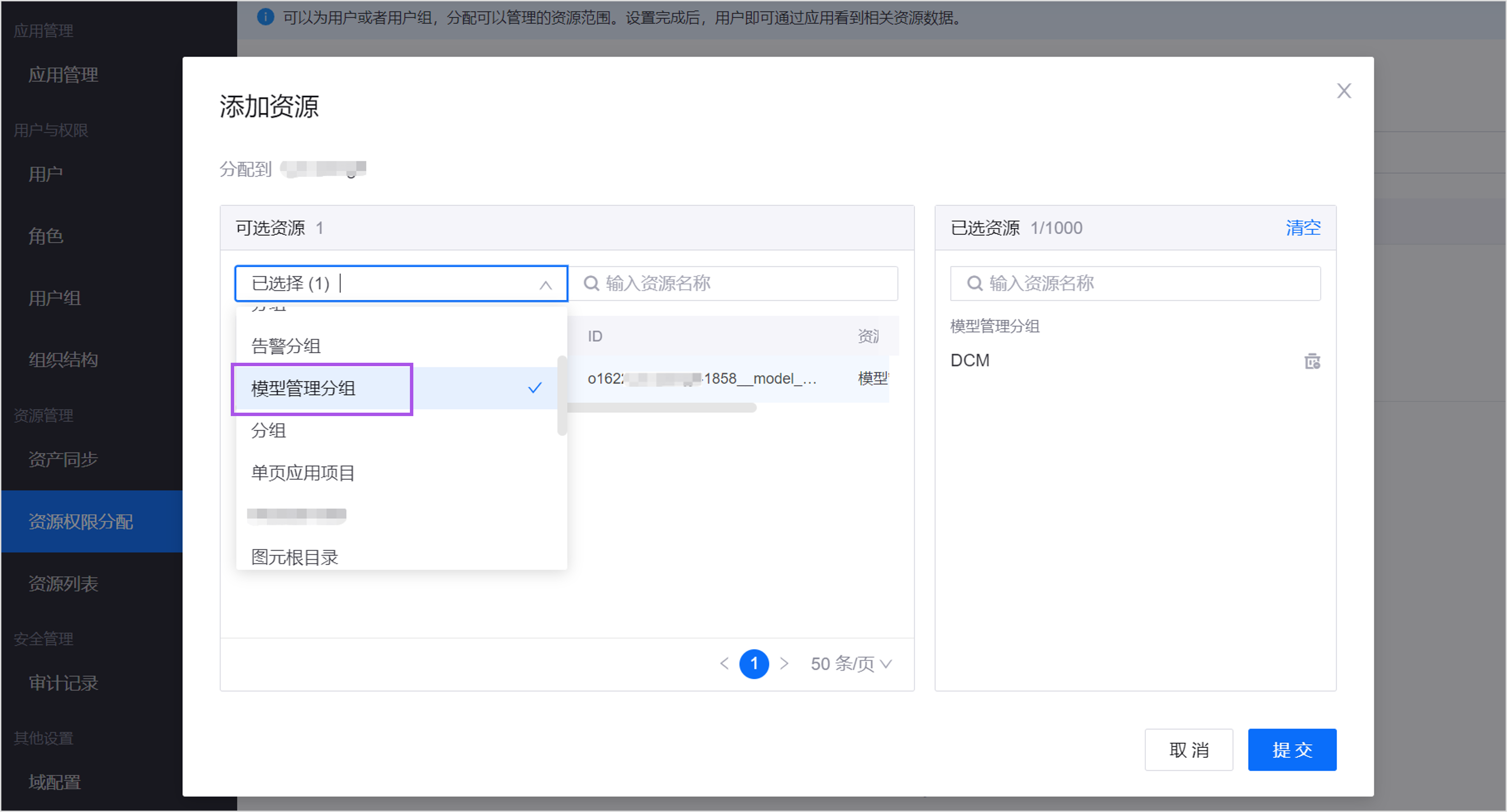 分配权限:开发者 OU 的 OU 管理员为模型管理方分配这一分组的资源和权限点。参见 在分组内添加和管理数据。