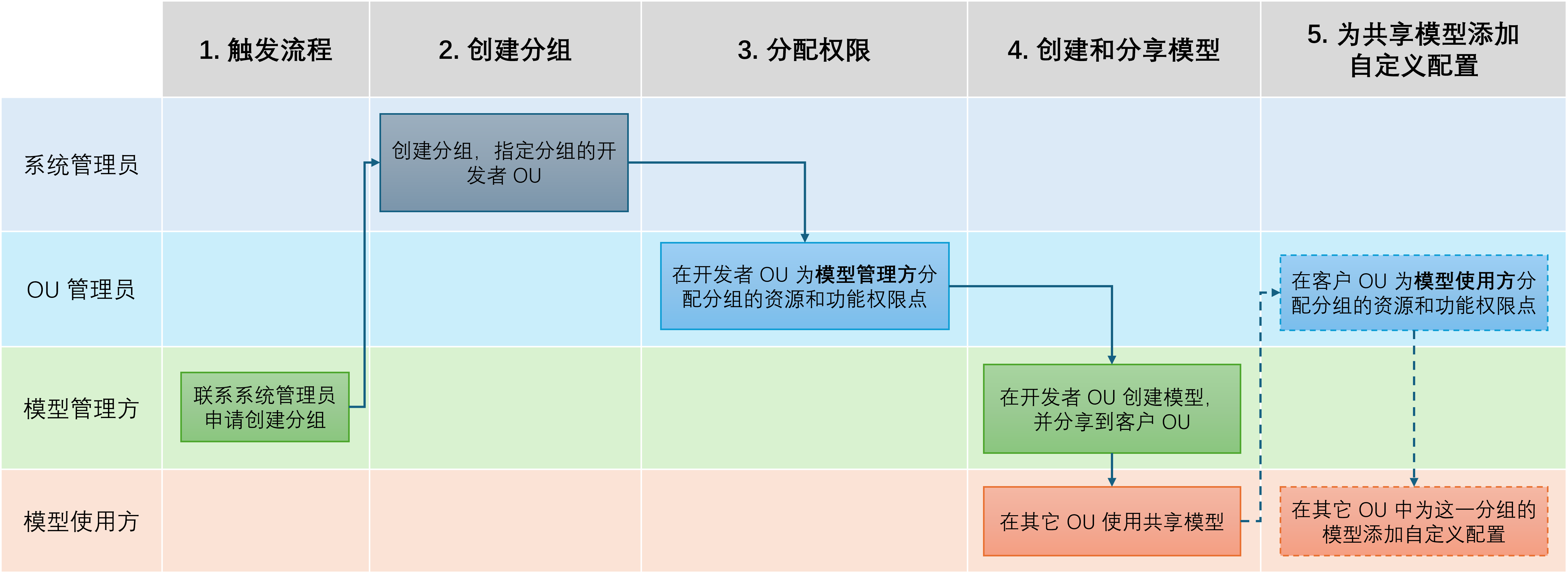 创建和分享模型:模型管理方在开发者 OU 中创建这一分组的模型,并分享到客户 OU。参见 配置分享策略。