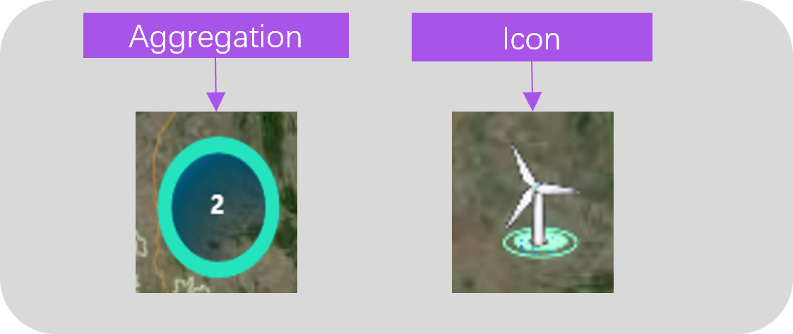 Asset icons display the information of an asset such as name, status and data on asset maps. An asset icon can be in the style of “Icon” or “Aggregation”.