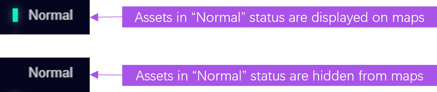 Asset status tags displayed on the current map are indicated by the corresponding color blocks that match the colors shown at the bottom of asset icons. For example, if the current map does not show assets in the Normal status, select Normal in the filter legend and a corresponding color block appears in front of the tag and the asset map displays assets in the Normal status, as shown below.