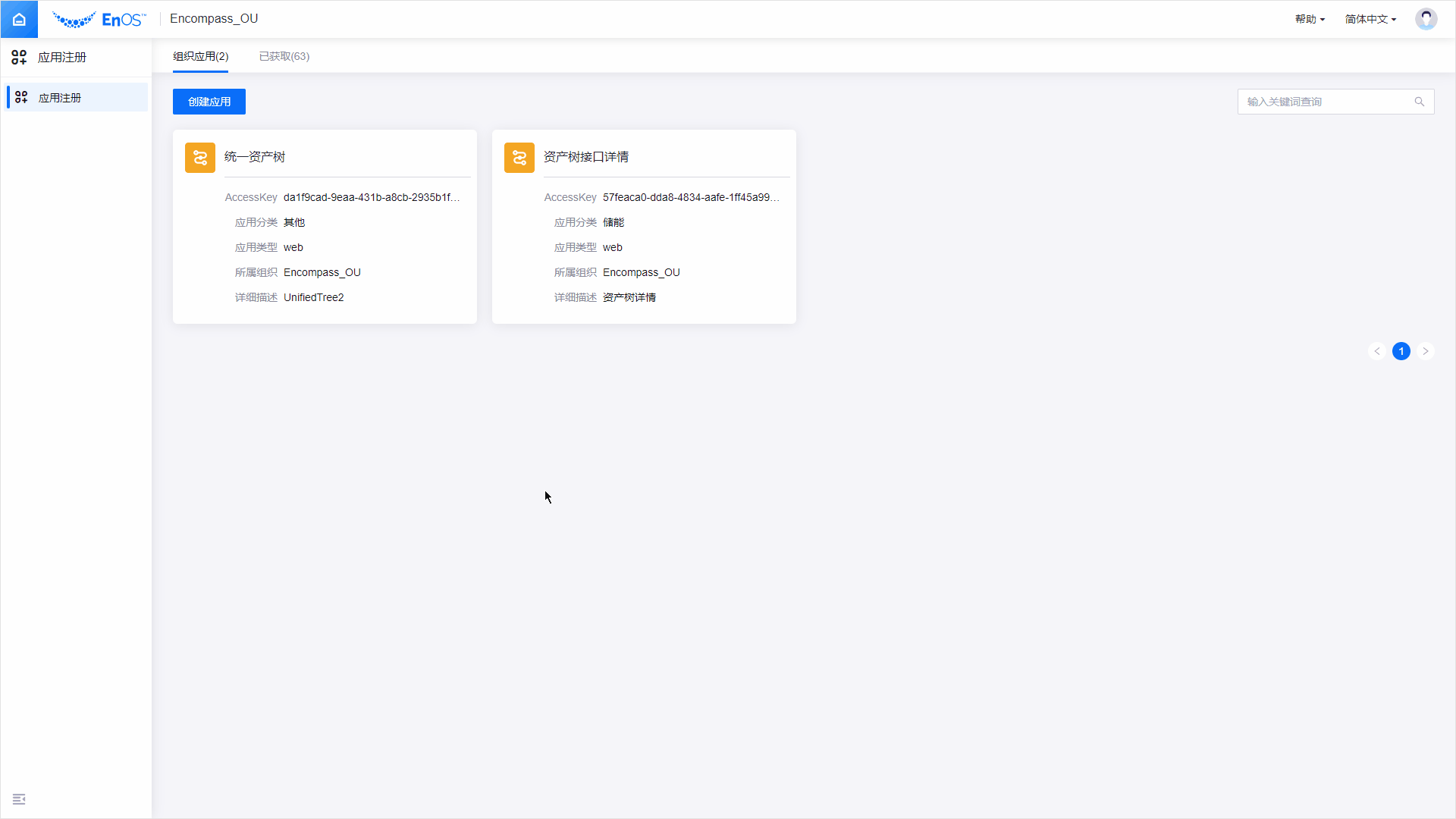 登录 EnOS 管理控制台,并在左侧导航栏中选择 应用注册。