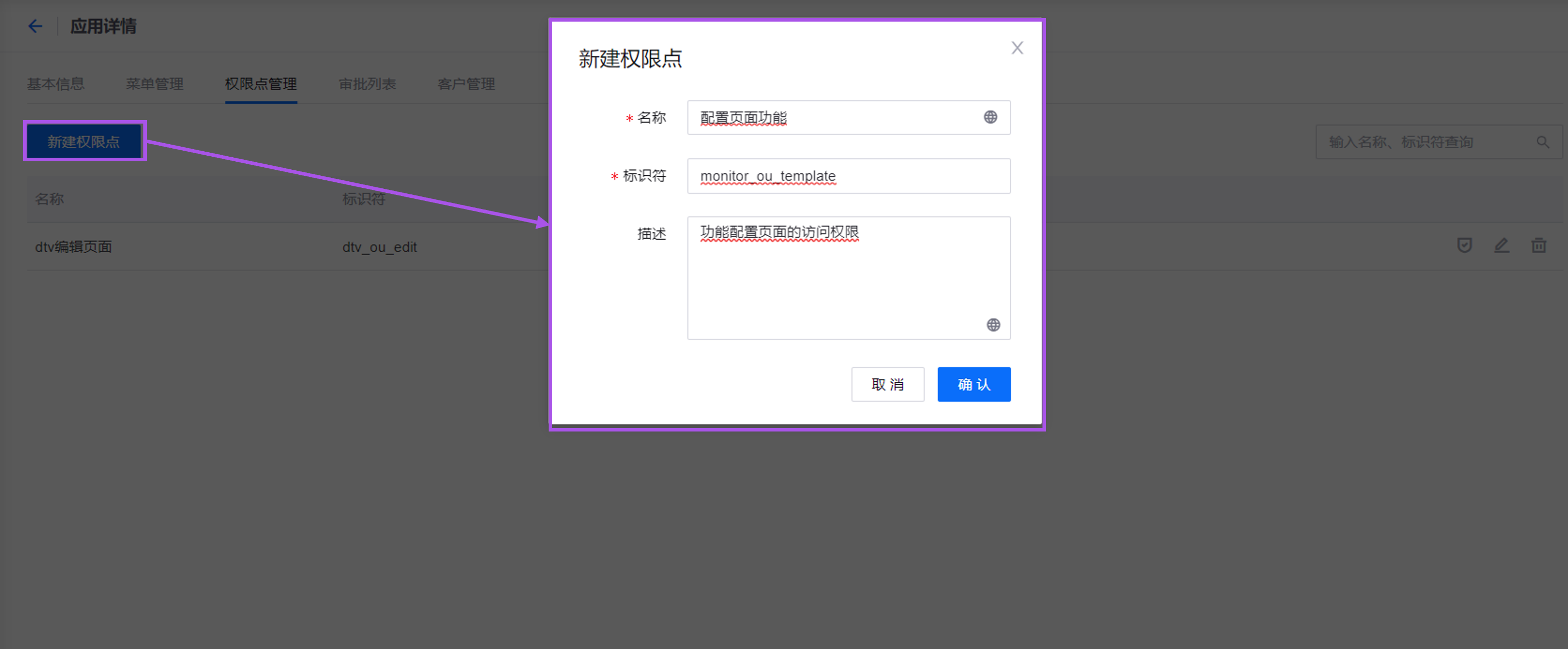 应用构建者可自定义权限点的名称和描述,但需要确保权限点标识符与本教程给出的标识符保持一致。