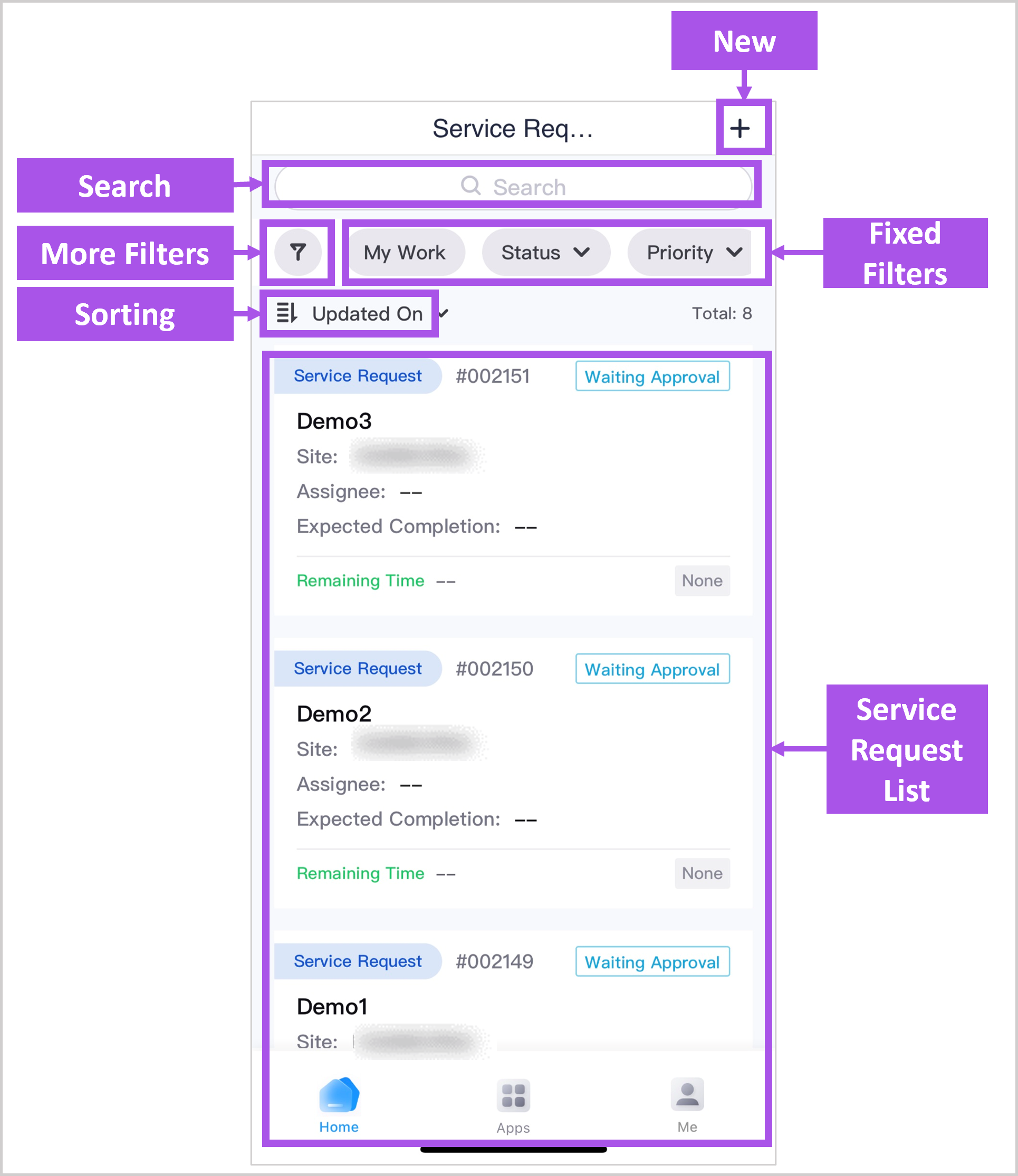 Service Request List: display service requests that match the filter conditions.
