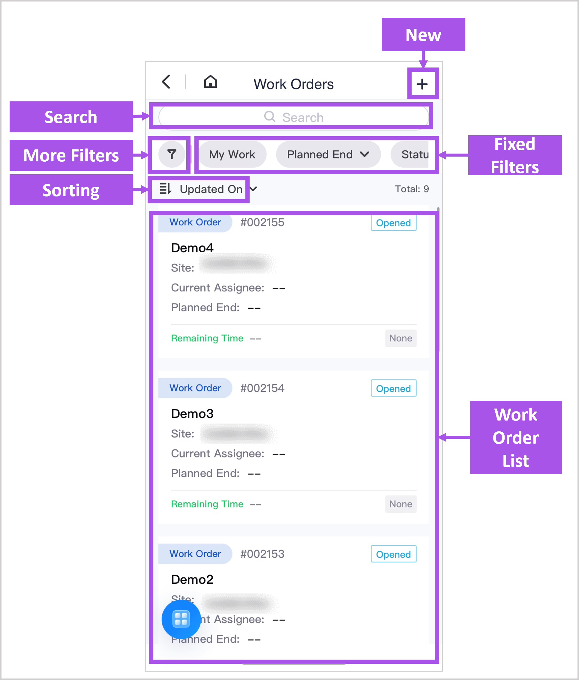 Fixed Filters: set the filter conditions for the work order list.
