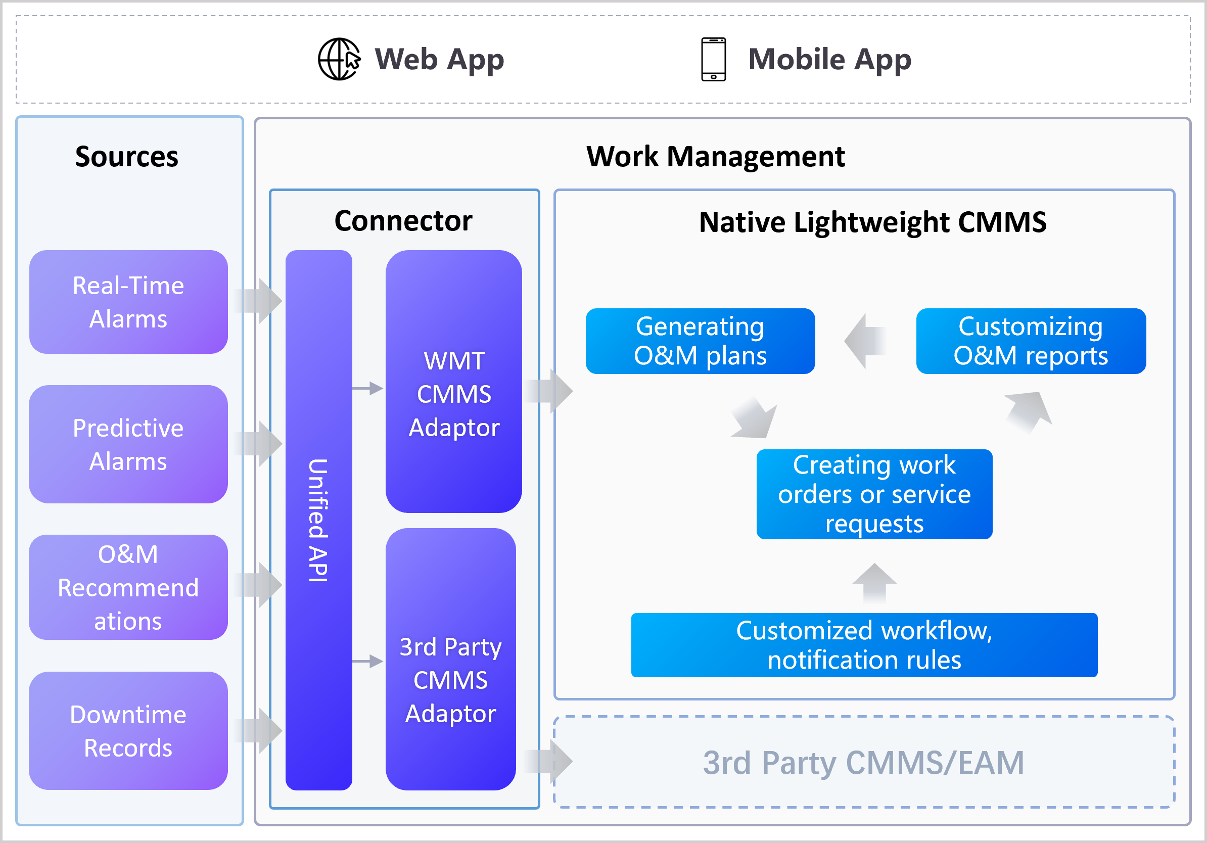 EnOS Work Management can be used both as an end-to-end ticket management tool and as an integration bridge between EnOS native applications and third-party CMMSs.