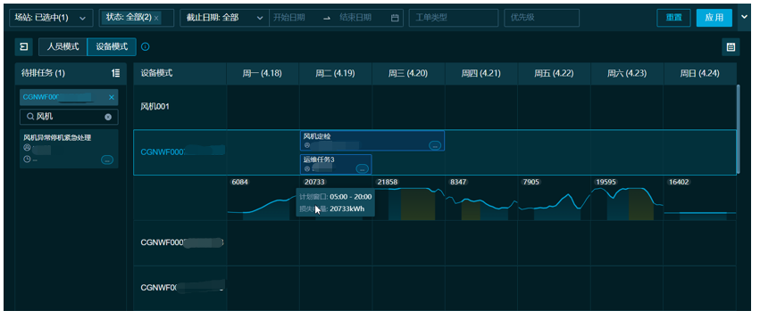 设备模式:排程区的左边第一列展示当前场站下的所有符合筛选条件的工单所关联的设备。选择任意设备,可以在 待排任务区 中筛选出所选设备的所有工单,再次选择设备则取消筛选。