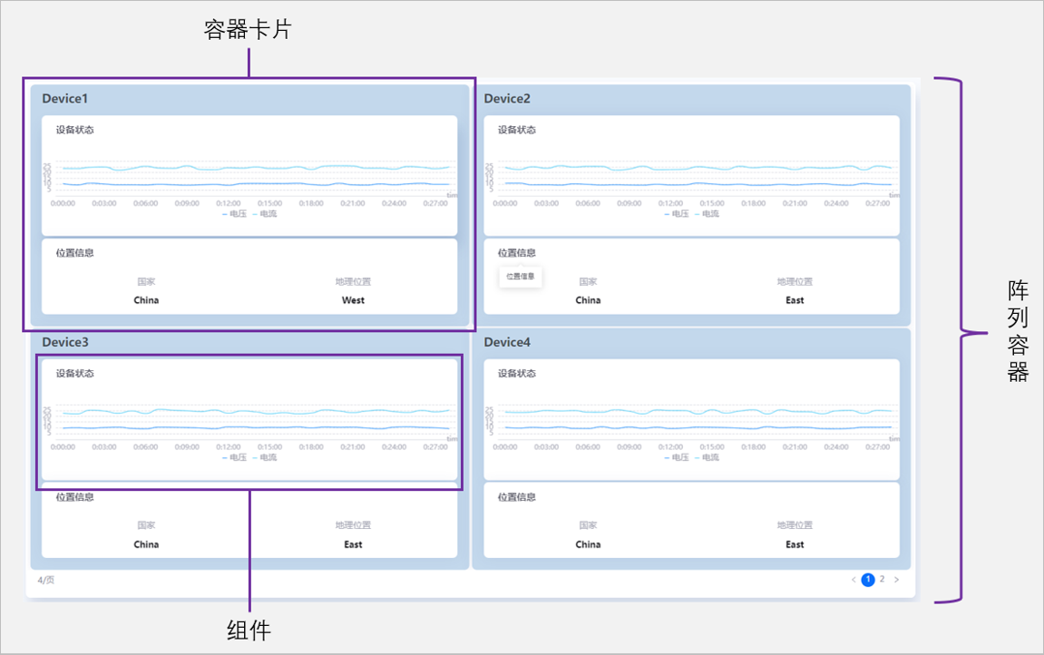 阵列容器根据对比需求,自动阵列平铺多个容器卡片,以容器卡片的形式展示多组数值信息,对比出不同资产设备的详情情况。在容器卡片中,能承载多个组件,可以灵活满足多设备场景。使用阵列容器可以快速构建多个相同布局的容器卡片,构建清晰的数据对比页面,提高 EnOS 数字孪生可视化效率。