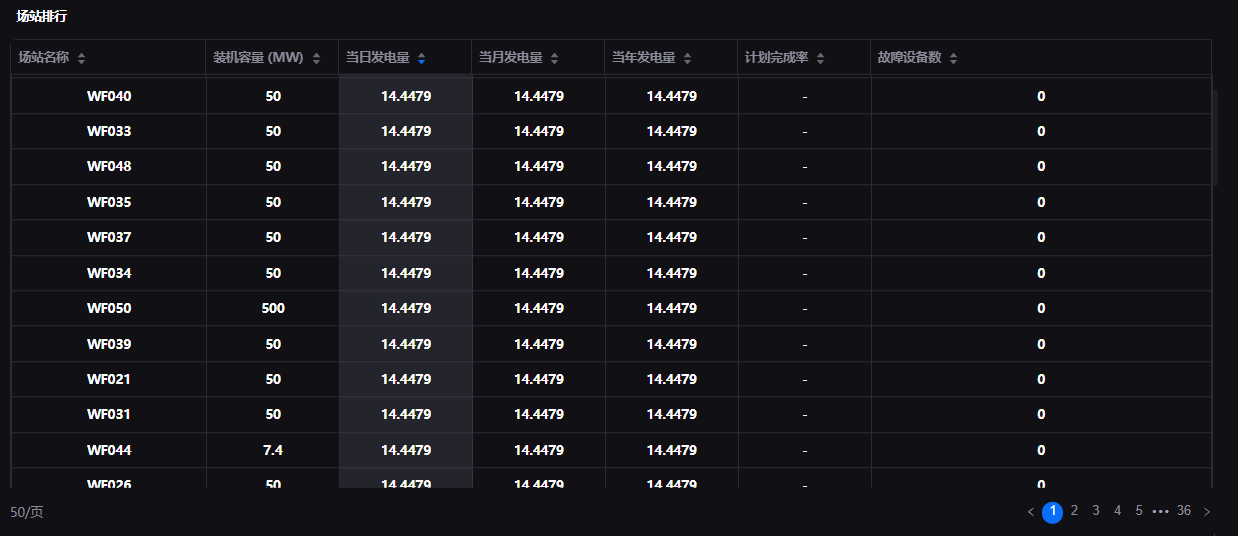 资产排行展示场站关键指标的排名情况,包含一个表格组件。表格组件用于以表格形式展现各资产的属性、测点或指标。更多信息,参见 表格。通过以下步骤配置展示各场站指标排名的表格组件: